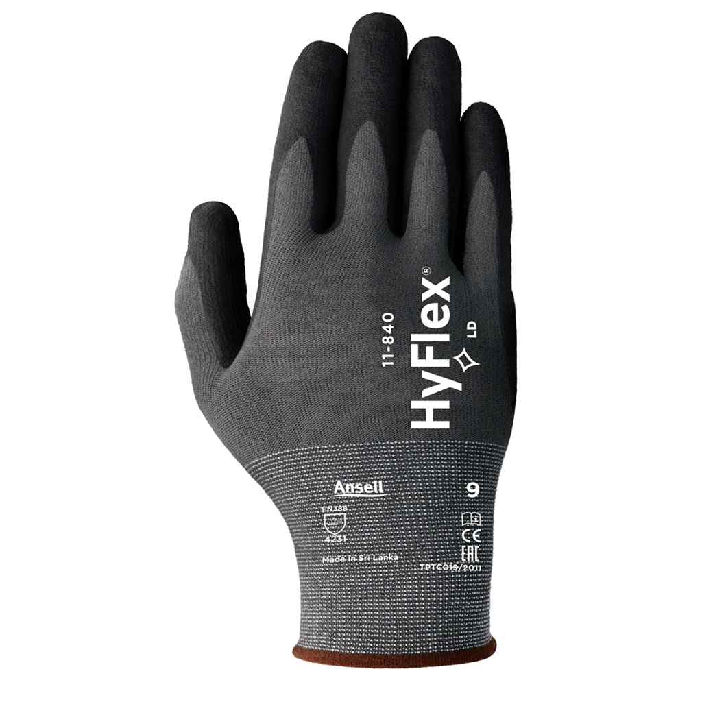 11-840-10 Guante de uso general con recubrimiento de espuma de nitrilo color negro con construcción tricotado. Puño tipo muñeca de punto con palma recubierta, forro de nylon, SPANDEX. Fabricado con 15 hilos. HyFlex.