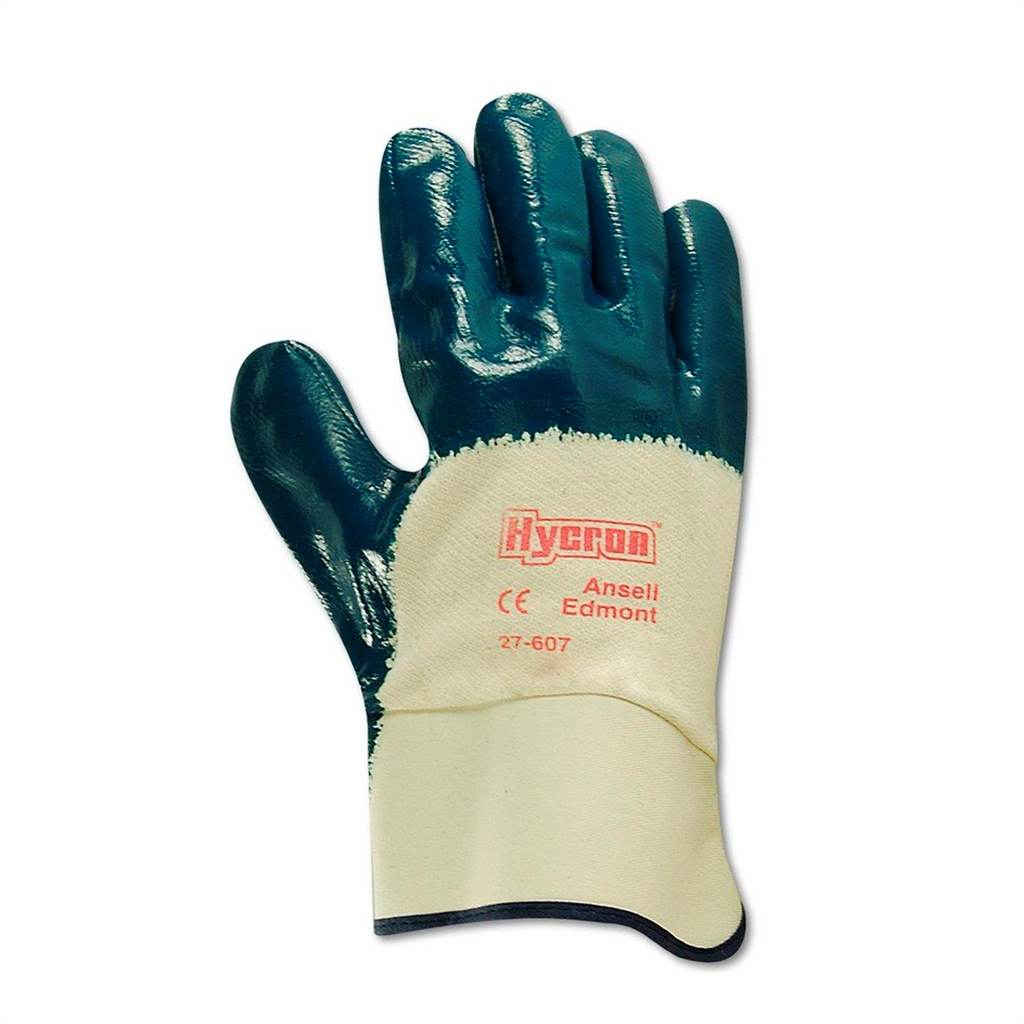 27-607-10 Guante contra petróleo con recubrimiento de nitrilo color azul. Puño tipo manguito de seguridad con acabado 3/4 recubierto. Forro de algodón tejido. ActivArmr.