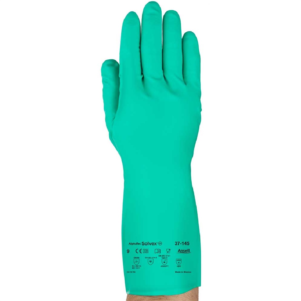 37-145-8 Guante contra qu micos, con recubrimiento de nitrilo verde. Tipo de Pu o tipo guantelete, superficie de agarre con acabado arena. Sin l tex. Grosor 11 mil, long 13 pul. AlphaTec Solvex.