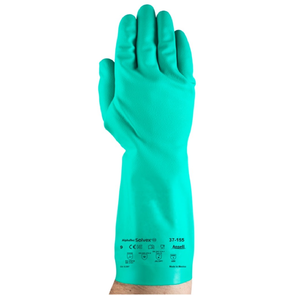37-155 T10 Guante contra qu micos, recubrimiento de nitrilo color verde. Sin soporte, tipo de Pu o guantelete. Clorado, sin l tex. Superficie de agarre, acabado arena. SOLVEX.
