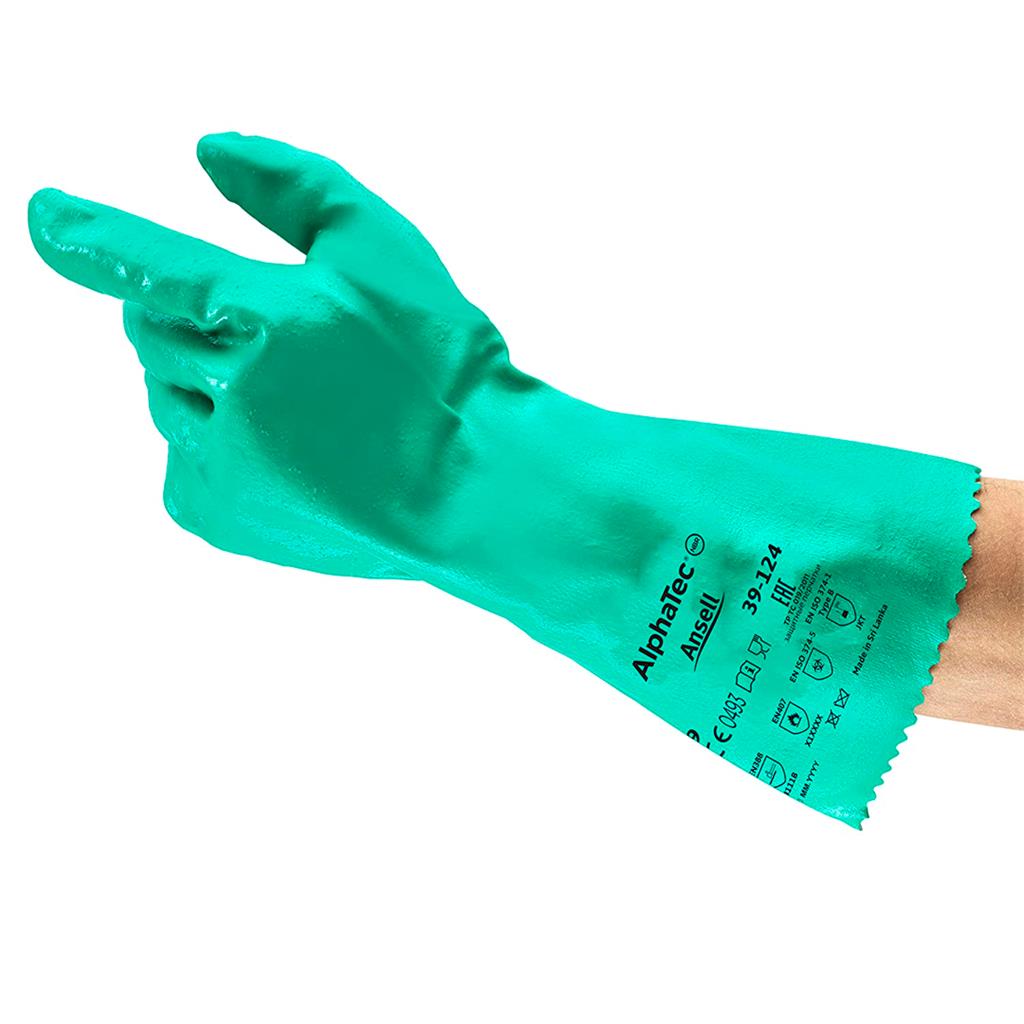 39-124-8 Guante contra químicos con recubrimiento de nitrilo color verde con soporte, puño tipo guantelete, longitud de 14 pulgadas. Superficie de agarre acabado rugoso. AlphaTec.