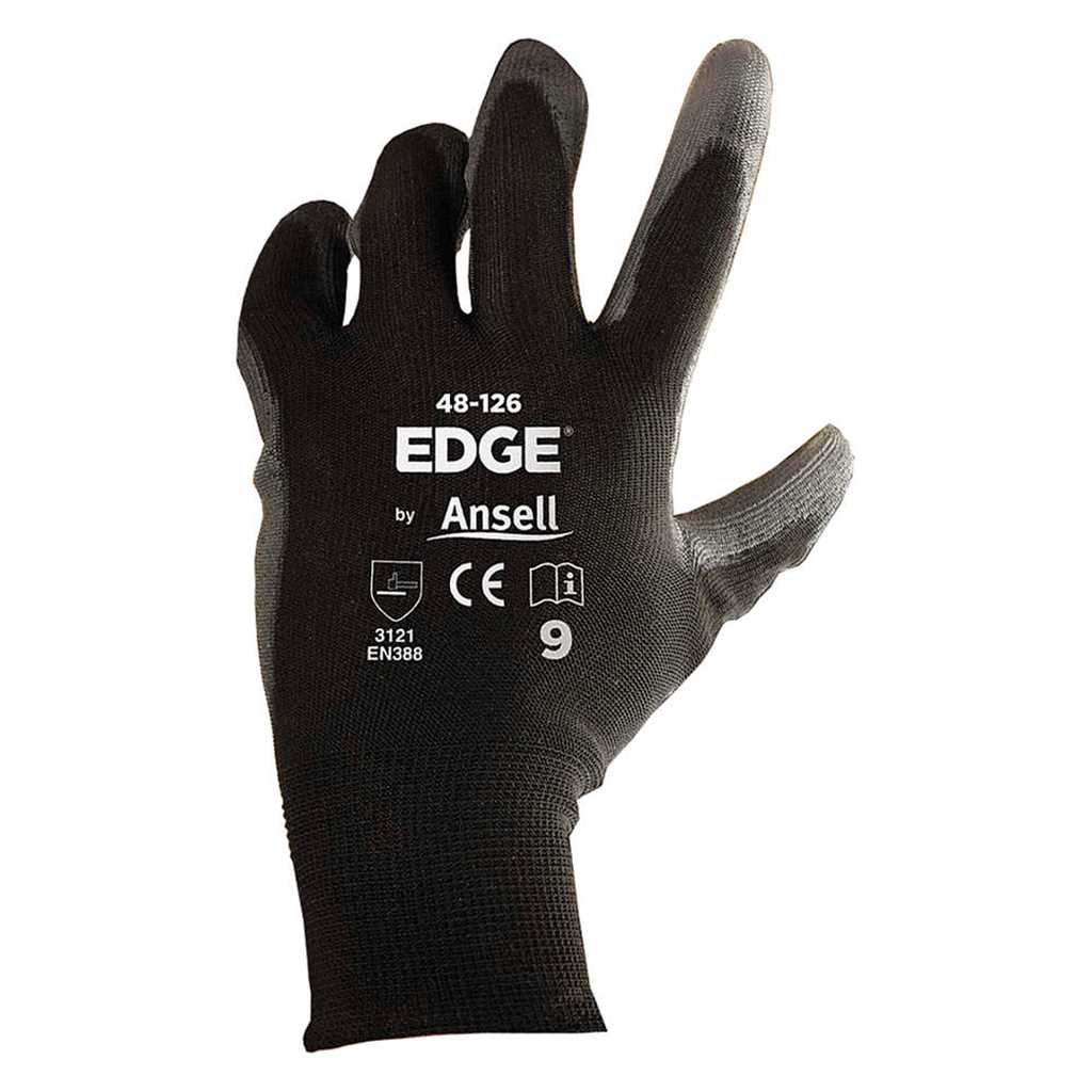 48-126-9 Guante de uso general con recubrimiento de poliuretano color negro. Con construcción tricotado, puño tipo muñeca de punto con palma recubierta, forro de poliéster. Fabricado con 15 hilos. EDGE.