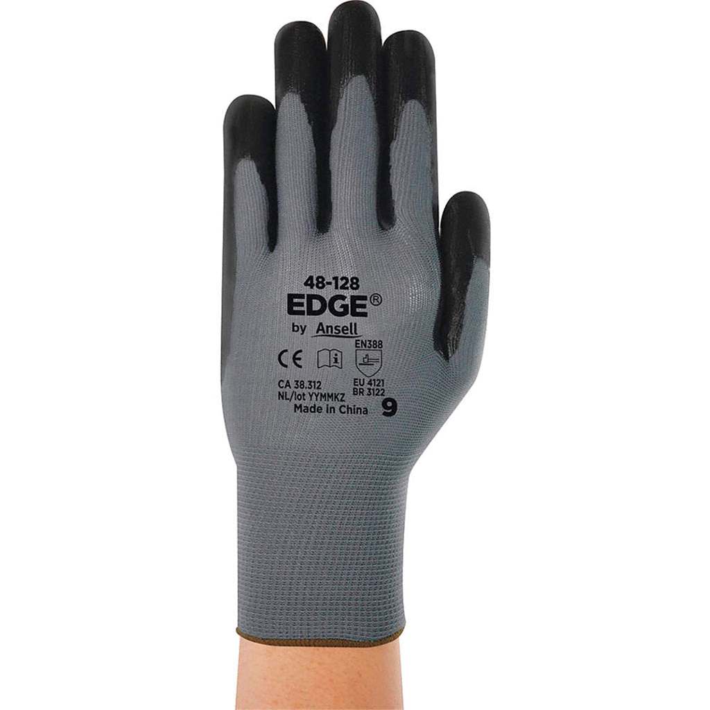 48-128-7 Guante de uso general con recubrimiento de nitrilo color negro. Con construcción tricotado, puño tipo muñeca de punto con palma recubierta, forro de poliéster. Fabricado con 13 hilos. EDGE.