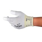 48-135-7 Guante de uso general con recubrimiento de poliuretano blanco. Con construcción tricotado, puño tipo muñeca de punto con la punta de los dedos recubiertas, forro de nylon, Fabricado con 15 hilos. HyFlex.