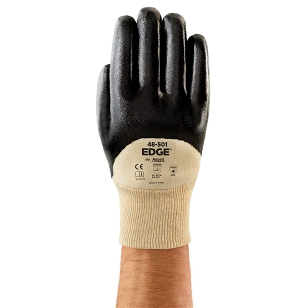 48-501-10 Guante contra petróleo con recubrimiento de nitrilo color negro. Construcción cortado y cosido. Puño tipo muñeca de punto con acabado 3/4 recubierto con superficie de agarre de acabado liso. Forro de algodón. EDGE.