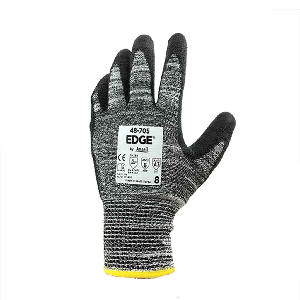 48-705-9 Guante contra corte nivel 6 con recubrimiento de poliuretano color negro. Puño tipo muñeca de punto con palma recubierta. Forro HPPE, SPANDEX, fibra de vidrio, nylon y poliéster. Fabricado con 13 hilos. EDGE.
