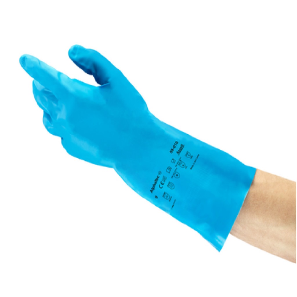 58-010 T9 Guante contra qu micos, de nitrilo azul. Sin soporte, tipo de Pu??guantelete. Sin silicona ni l tex. 11 mil.