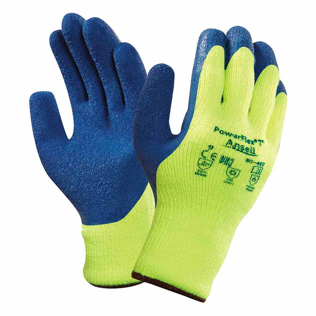 80-400-8 Guante contra frio con recubrimiento de látex de caucho natural color azul. Puño tipo muñeca de punto y palma recubierta de acabado rugoso con forro de tejido esponja de acrílico. Fabricado con 7 hilos.