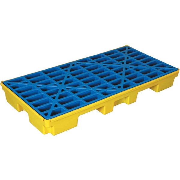 107783 SC-SD2 Plataforma para derrames, para dos tambos. Color amarillo con azul. Dimensiones de: 6 in H x 26 in W x 52 in L. Absorbe hasta 21.2 gal.