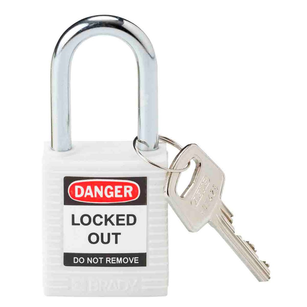 143123 Candado de seguridad para bloqueo, color blanco. Con espacio en el arco vertical de acero de 1.5 IN. Mecanismo de llave de tambor perno estándar con retención de llave. Tamaño del cuerpo de 1.75 in H x 1.5 in W x 0.8 in D.