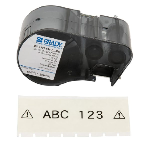 143366 MC-1500-595-CL-BK Cinta de etiquetas de vinilo con adhesivo, color negro con transparente. Cinta de impresi n para BMP51. tama o de la etiqueta 1.5 in W x 20 ft L.