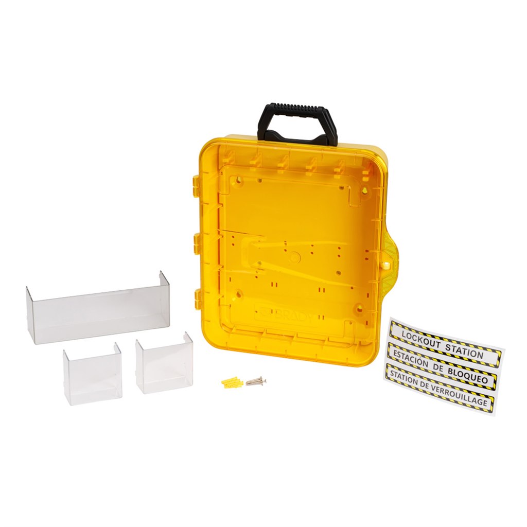 170397 Y5069042 Estaci n de bloqueo de 12 candados. Material de polipropileno, color amarillo con negro. Dimensiones de; 16 in H x 14 in W x 3.5 in D. Incluye: (1) Manija para transportar; (6) Ganchos para candados (con capacidad para 2 candados); (2) Porta tarjetas; (1) Contenedor de dispositivos; Etiquetas triling es.