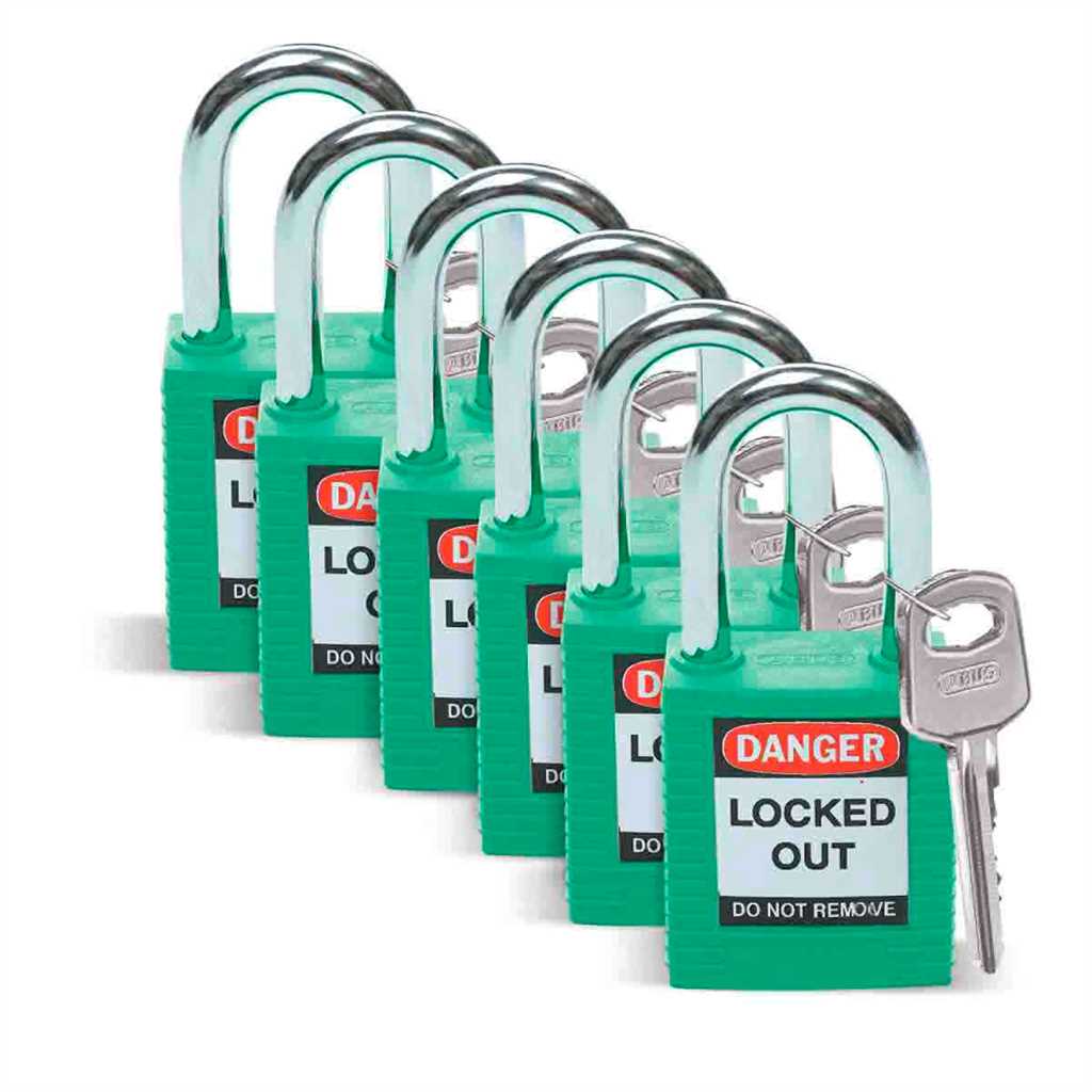 51345 Candado de seguridad para bloqueo, color verde. Con espacio en el arco vertical de acero de 1.5 IN. Mecanismo de llave de tambor perno estándar con retención de llave. Tamaño del cuerpo de 1.75 in H x 1.5 in W x 0.8 in D. Paquete de 6.