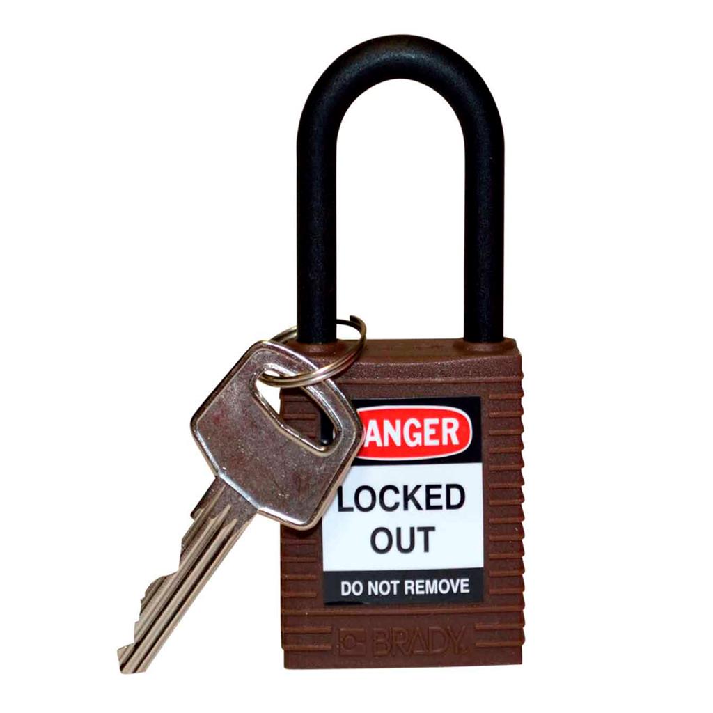 123330 Candado de seguridad para bloqueo, color café. Espacio vertical en el arco de nylon de 1.5 pul, mecanismo de llave de tambor de pernos estándar, con retención de llave. Tamaño de 1.75 in H x 1.5 in W x 0.8 in D.