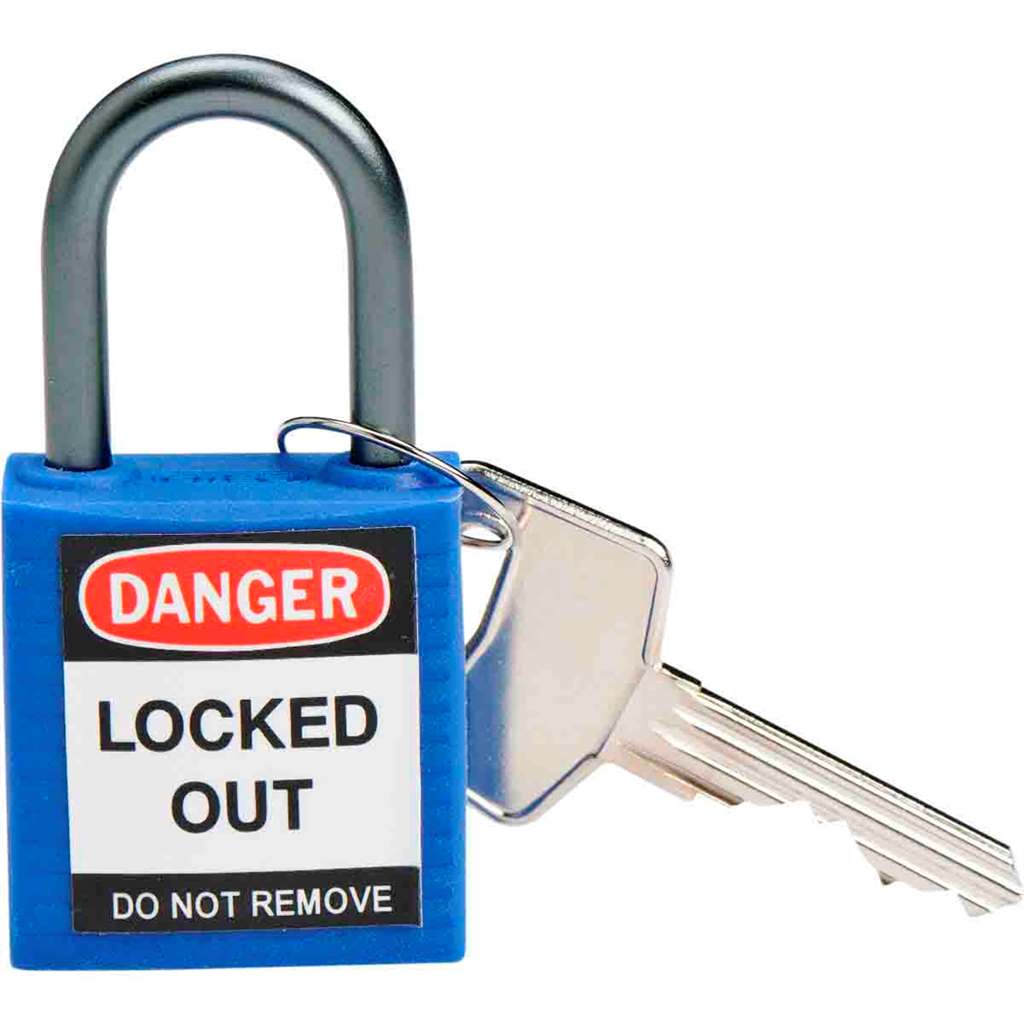 143156 Candado compacto de seguridad para bloqueo, color azul. Con espacio en el arco vertical de aluminio de 1 in. Mecanismo de llave tambor de pernos estándar con retención de llave. Tamaño del cuerpo de 1.4 in H x 1.2 in W x 0.625 in D.