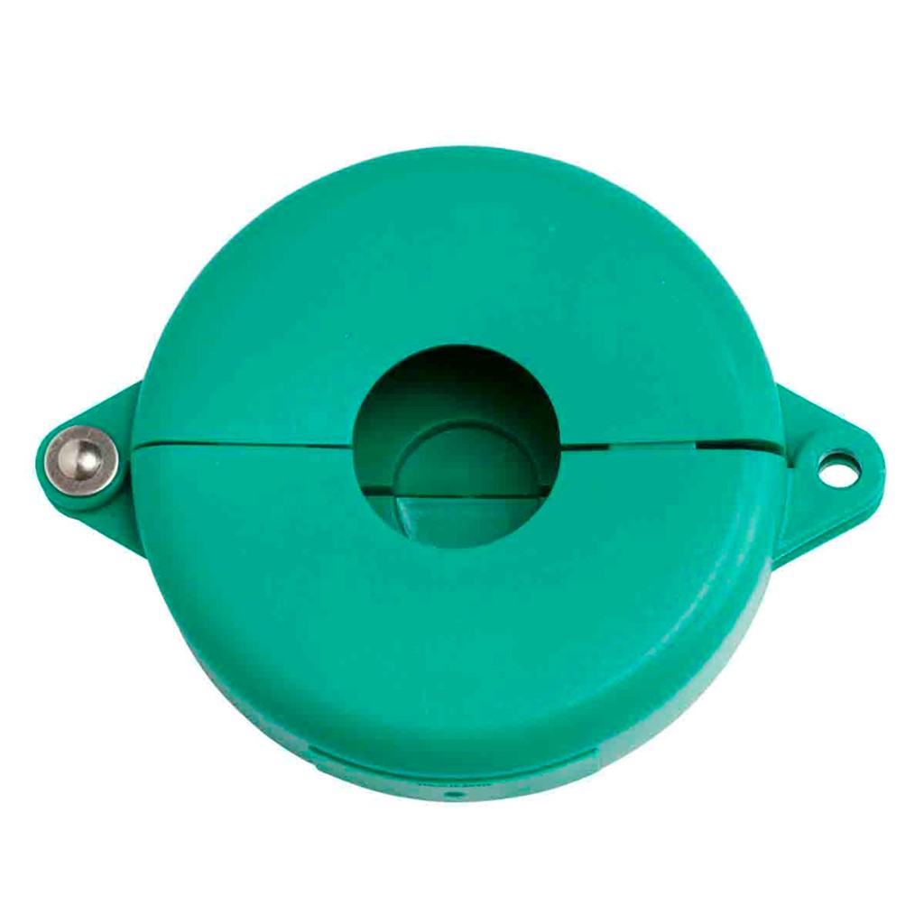 65596 Dispositivo de bloqueo para válvulas de compuerta, de polipropileno color verde, con bisagra. Rango de diámetro de la rueda de la válvula 2.5-5 IN. Dimensiones de 2 in H x 7.28 in W x 5.2 in Dia x 1.99 in D.