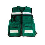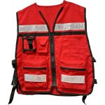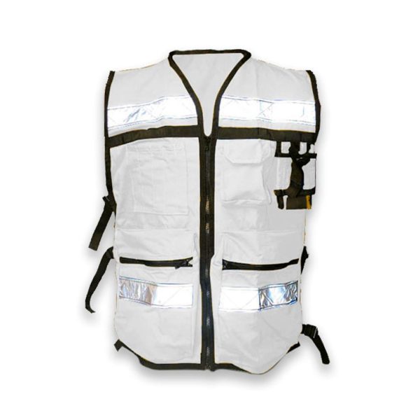 CHBRIG-BL Chaleco brigadista color blanco, 100% de algodón. Con polipropileno en todo el contorno de la prenda, color negro. 5 bolsas frontales. Cierre frontal y cuatro broches tipo Samsonite, con cintas reflejantes.