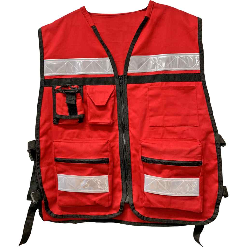 CHBRIG-NA UNITALLA Chaleco brigadista color naranja, 100% de algodón. Con polipropileno en todo el contorno de la prenda, color negro. 5 bolsas frontales. Cierre frontal y cuatro broches tipo Samsonite, con cintas reflejantes.