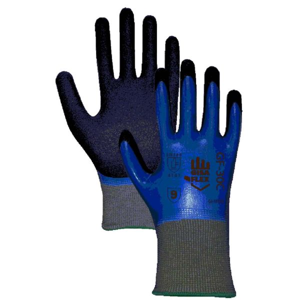 GI-NNS2 – 6 Guante tejido de nylon, color negro con recubrimiento de nitrilo laminado azul y nitrilo arenado negro en palma.