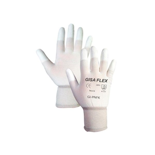 GI-PNFK-6 Guante de uso general de nylon, color blanco. Recubierto de poliuretano en la punta de los dedos, con puño tejido de punto y ribeteado.