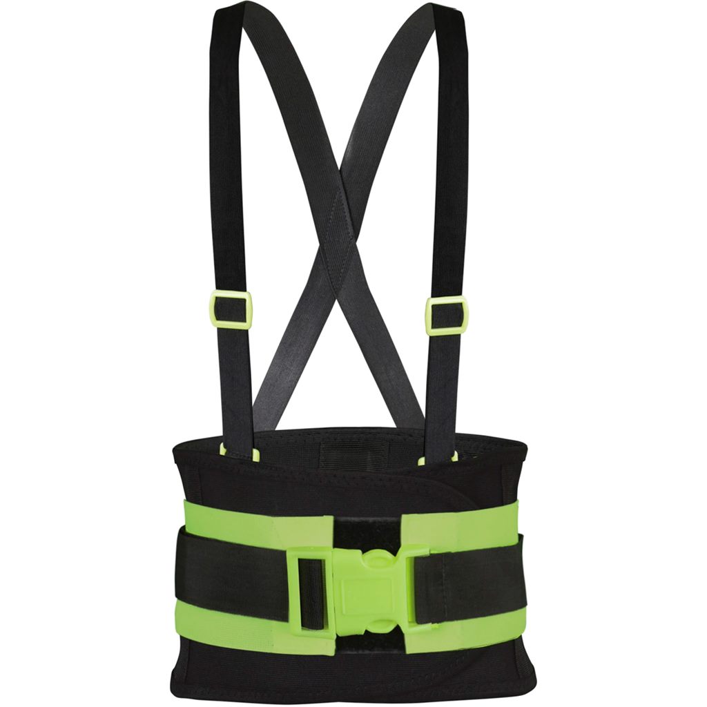 825MD3CS Soporte sacrolumbar, color negro con banda elástica de alta visibilidad. Tirantes elásticos, cierre delantero, tercer cinturón deslizable. 4 varillas en la espalda y una varilla central. Hebillas de ajuste.