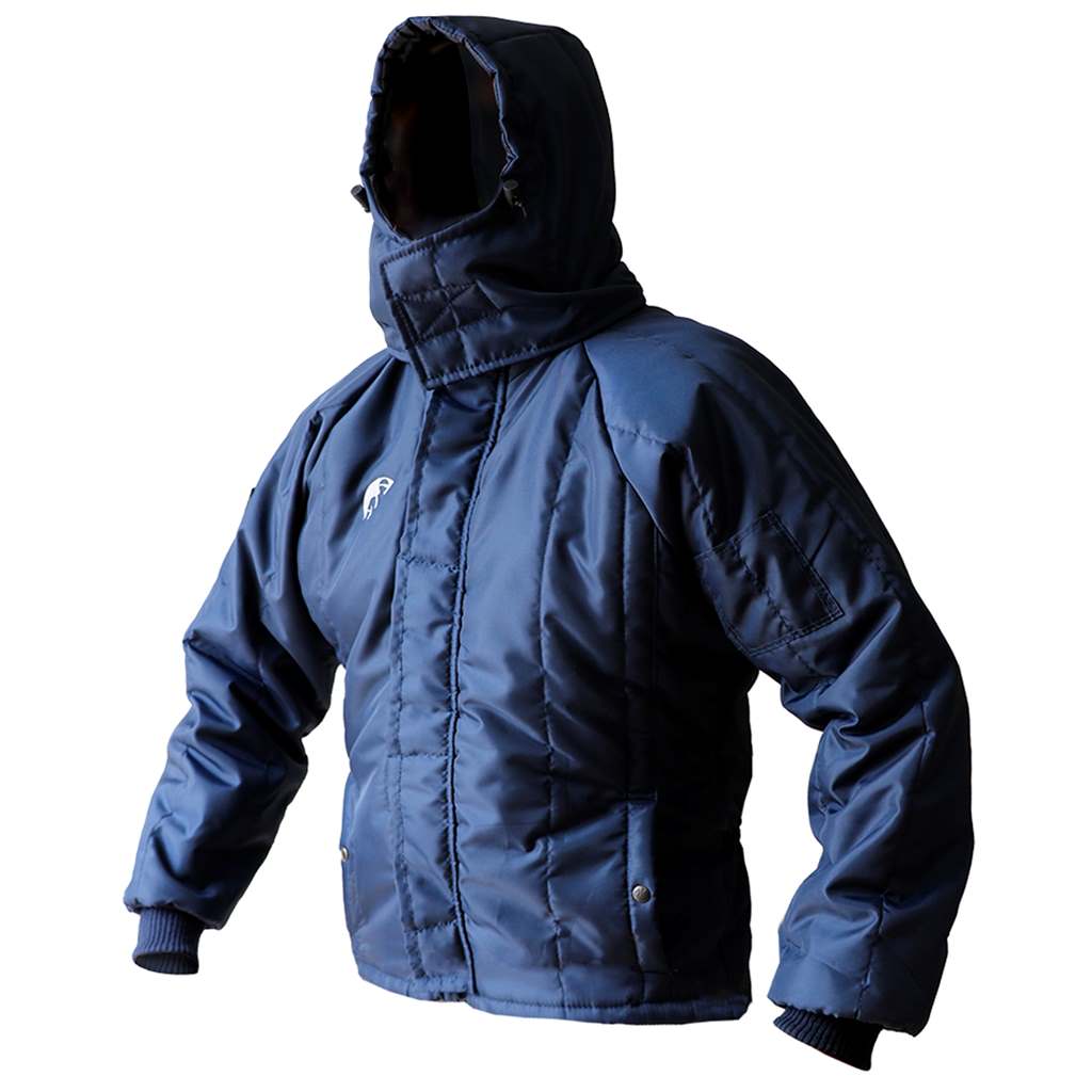 DD-401-M Chamarra corta termoaislante, color azul. Cierre largo en la parte frontal, doble solapa, 2 bolsillos cálidos, cordón de ajuste en gorro. Elástico en muñecas y gorro desmontable tipo escafandra.