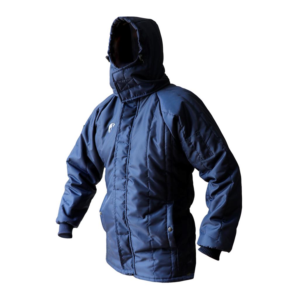 DD-408-XL Chamarra cazadora termoaislante, color azul. Cierre largo en la parte frontal, solapa con 5 botones, 2 bolsillos para manos, cordón de ajuste en gorro, elástico en cintura.