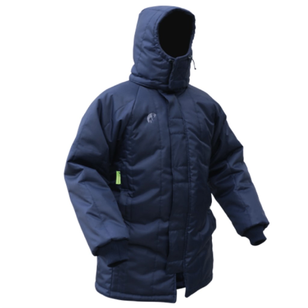 ECO-218XG Chamarra cazadora termoaislante. Gorro tipo escafandra ajustable, desmontable con cierre de seguridad, cuello suave y c modo con forro interno de felpa polar. Cierre de seguridad en la parte frontal. Doble solapa amplia que cubre el cierre y los broches. Doble capitoneado, manga libre de tensi n. Todas las costuras son interiores. Con 5 broches met licos fabricados de lat n no oxidables. Ajuste de cintura y ajuste el stico en mu ecas.