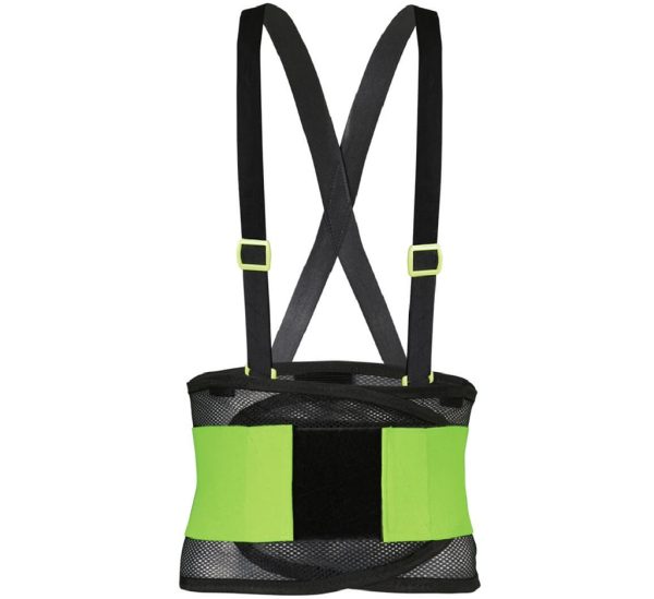 JYR-800-GD Soporte sacrolumbar de malla, con tirantes el sticos de 1 1/4 pul. Hebilla de ajuste. Cierre delantero de gancho y felpa. Banda el stica de alta visibilidad y 4 varillas en espalda de 6 pul x 1/2 pul.
