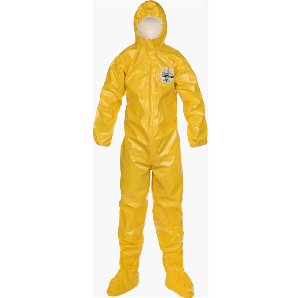 C4T151Y-M Overol amarillo, con capucha y botas con ajuste de respirador. Costuras selladas con cinta, mu eca el stica, solapa contra tormentas sobre la cremallera. ChemMax 4 Plus.