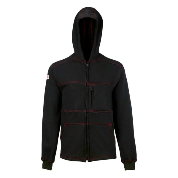 IHD12ANT01-XL Chamarra estilo deportivo color negro, con capucha. Cierre con cremallera de polímero, bolsas al frente, con puños de punto elástico, bolsa tipo napoleón al frente con cierre con cremallera. Protección contra arco eléctrico Categ 3.
