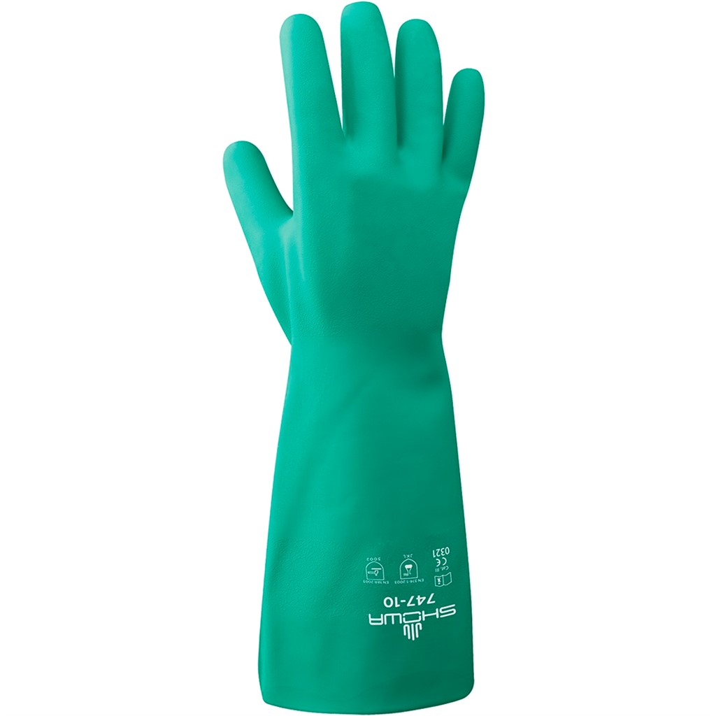* 747-07 Guante contra químicos con recubrimiento de nitrilo color verde claro sin soporte, acabado grabado. Largo de 19 pulgadas y grosor de 22 mil.