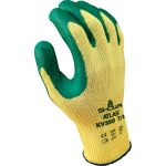 KV350-8 Guante contra corte A3 con recubrimiento de nitrilo, color amarillo con recubrimiento verde. Forro kevlar tejido sin costuras, de acabado rugoso.